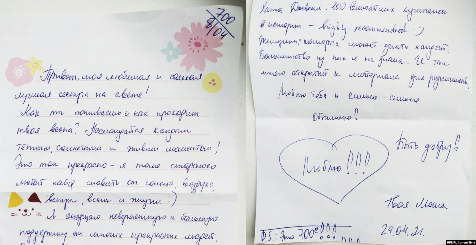 "Первое письмо от Маши пришло 22 сентября. На нем написано даже "письмо №1″, – рассказывает ее сестра Татьяна Хомич. – Она пишет: "Пиши по мере возможностей, как поживают наши ребята, как команда", – что она очень скучает и верит в них, волнуется, конечно, за родных, как они восприняли эти новости, как пережили. Это про папу, это про бабушку с дедушкой, других родных". (Бабушка Марии умерла в июне 2021 года.)