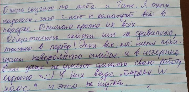 "В сентябре-октябре от Маши приходили письма, где было написано про бардак и хаос, – но все равно они дошли. В целом она всегда пишет, как у нее дела, какие книги она читает, что в них интересного нашла. Пишет слова поддержки. Пишет, чем занимается, что занимается спортом. Иногда – про следственные действия: что у нее был очень сложный день, например с допросом целый день. Но она никогда и не была резкой, чтобы какие-то резкие заявления вставлять".
